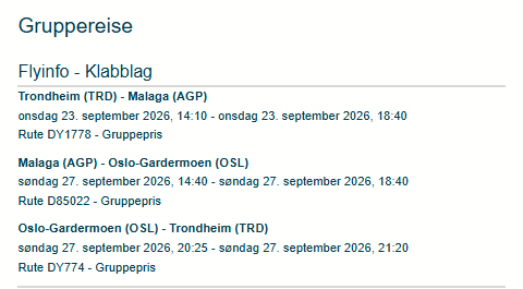 Utreise: Direktefly fra Trondheim 23.09.26 kl. 13.10 med ankomst Malaga kl. 18.40.